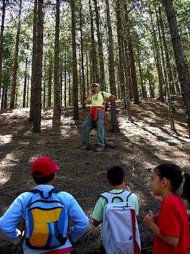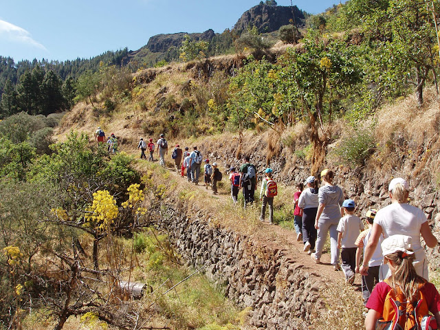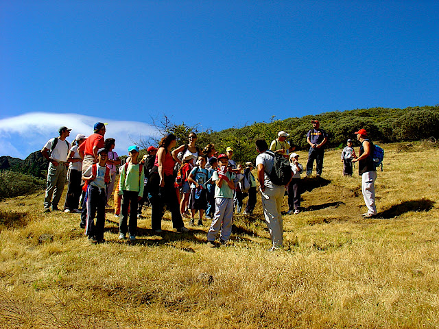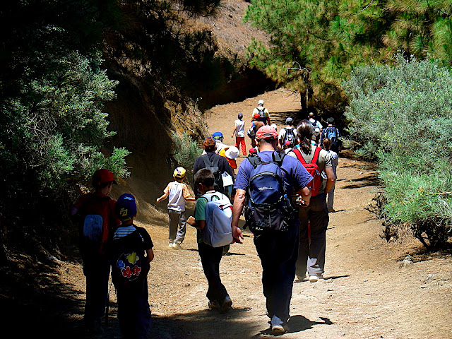 Dos miniguaguas conducen al grupo, 36 personas de entre 2 y xx años.... o más ¡¡¡ hasta la salida del sendero.
