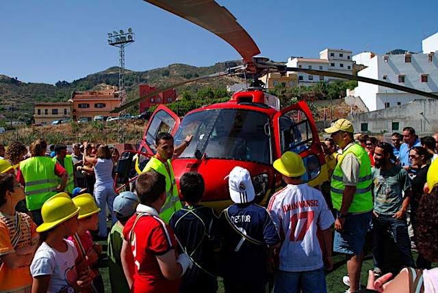 Después de la tempestad siempre viene la calma que es donde ahora mismo estamos. A las 7:00 am, como estaba previsto, nos reunimos los voluntarios, socios, dos miembros de Protección Civil. Nada mas empezar, y antes de desayunar, hicimos 100 bocadillos, preparamos mesas y montamos las carpas que amablemente había cedido el Ayuntamiento de Santa Brígida, con lo que cuando vino el desayuno devoramos. Poquito después empezaron a llegar las distintas unidades, entrada y salida continua de vehículos de emergencias, algo se estaba cociendo en la Vega, hasta que a las 9:45 tres vehículos escoltados por la policía local tocaron diana con sus sirenas despertando hasta el más resacado. A las 10 inauguración por parte de los representantes de la organización, el municipio y los participantes. A la quema controlada de la pinocha por parte de los bomberos forestales de la UOFF sucedió el aterrizaje de un helicóptero de la misma unidad llegado de Artenara. Tras unas breves palabras de los pilotos dirigidas a los peques, los nervios pudieron con ellos y poquito a poco fueron subiendo a la nave, fotos y más fotos, fue todo un espectáculo. Posteriormente unidades del consorcio de bomberos,